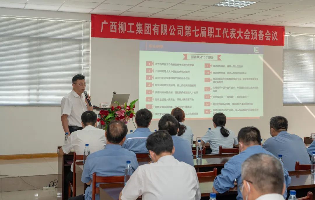 廣西柳工集團(tuán)有限公司黨委副書(shū)記、紀(jì)委書(shū)記、工會(huì)主席賴頌平在第七屆職工代表大會(huì)預(yù)備會(huì)議上向廣大職工代表宣講黨的二十大精神。