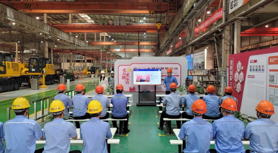 廣西柳工機(jī)械股份有限公司黨委組織一線員工,在習(xí)近平總書(shū)記視察過(guò)的柳工大型挖掘機(jī)裝配車間集中學(xué)習(xí)黨的二十大精神。
