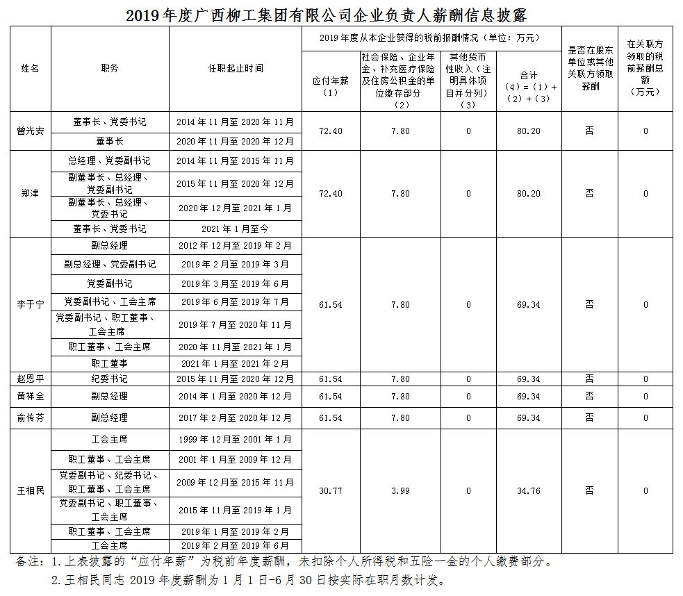 2019年度廣西柳工集團有限公司企業(yè)負(fù)責(zé)人薪酬信息披露