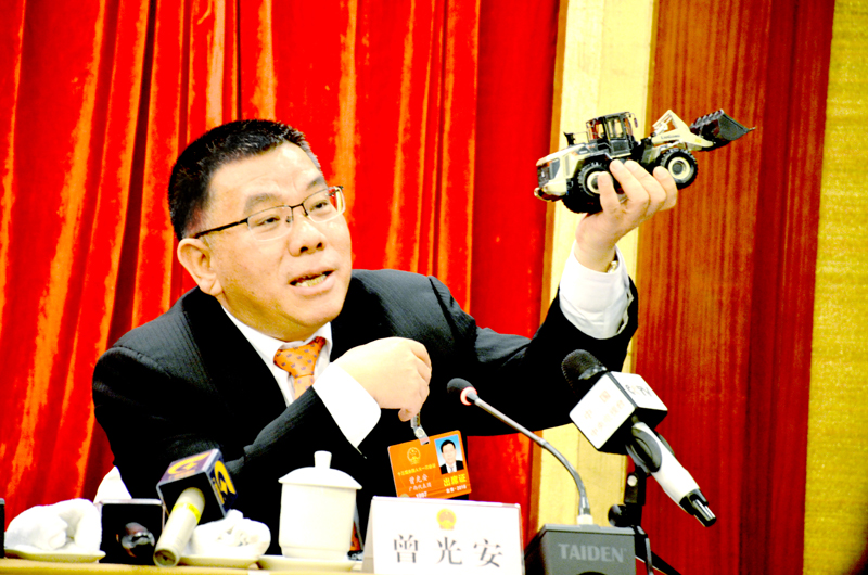 曾光安在廣西代表團(tuán)媒體見面會(huì)上展示柳工裝載機(jī)模型