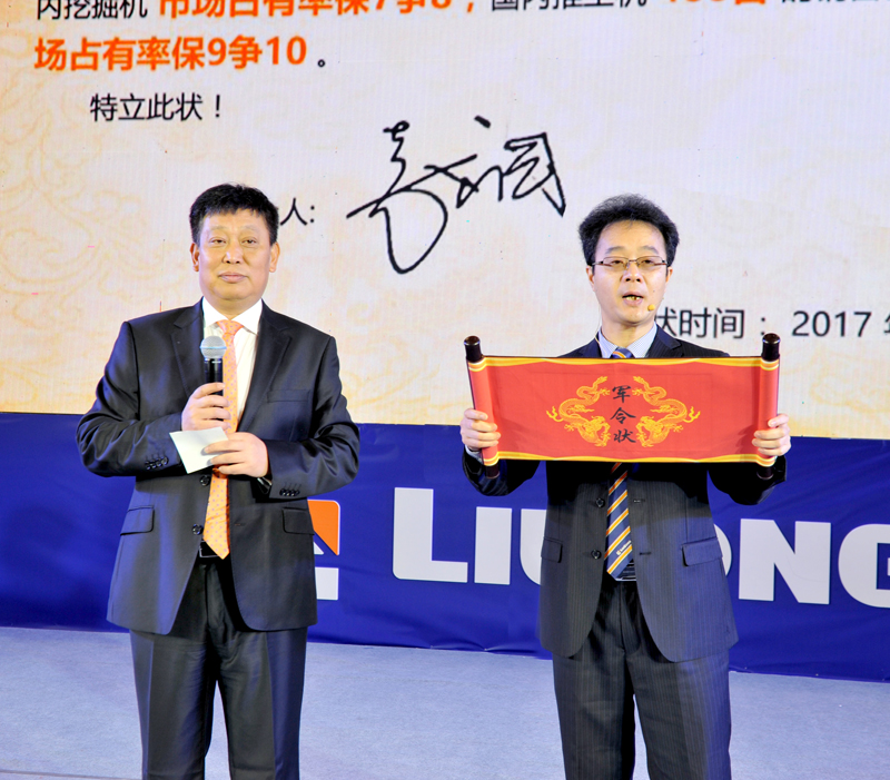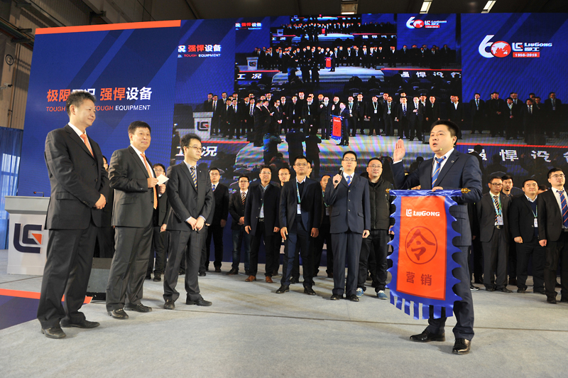 活動(dòng)現(xiàn)場舉行了軍令授旗儀式(如下圖)。柳工挖掘機(jī)、推土機(jī)的研發(fā)、采購、生產(chǎn)、營銷團(tuán)隊(duì)分別接受領(lǐng)導(dǎo)下達(dá)的任務(wù)指令,并當(dāng)場宣誓,保證完成任務(wù)!