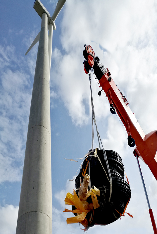 風(fēng)電是一種清潔的可再生能源,近年來世界各國均大力扶持并加快發(fā)展風(fēng)電,全球各大風(fēng)電主機廠商也在大力搶占各國優(yōu)質(zhì)風(fēng)電資源。印度班努爾風(fēng)塔體外索項目的成功開發(fā),為歐維姆公司拓寬海外風(fēng)電市場打下了基礎(chǔ)。下圖為風(fēng)電設(shè)備的吊裝。